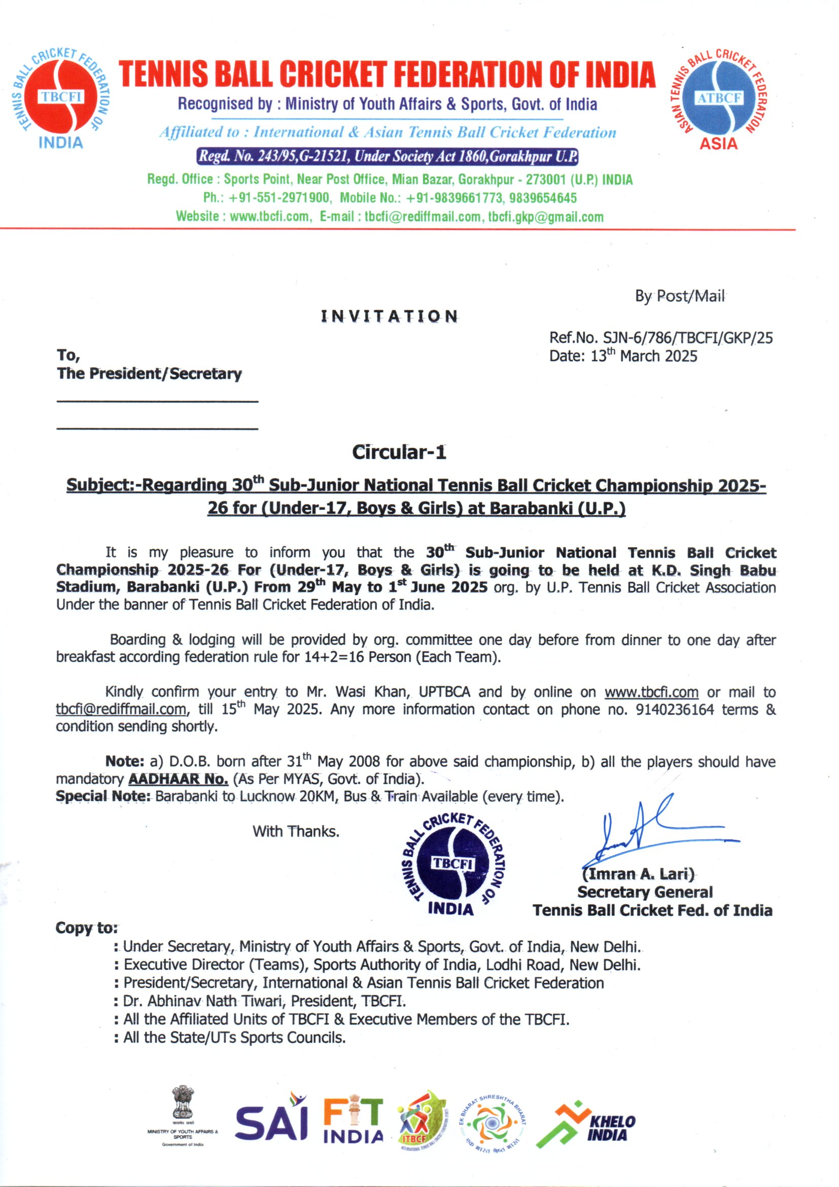 Affilated To : International & Aasian Tennis Ball Cricket Federation