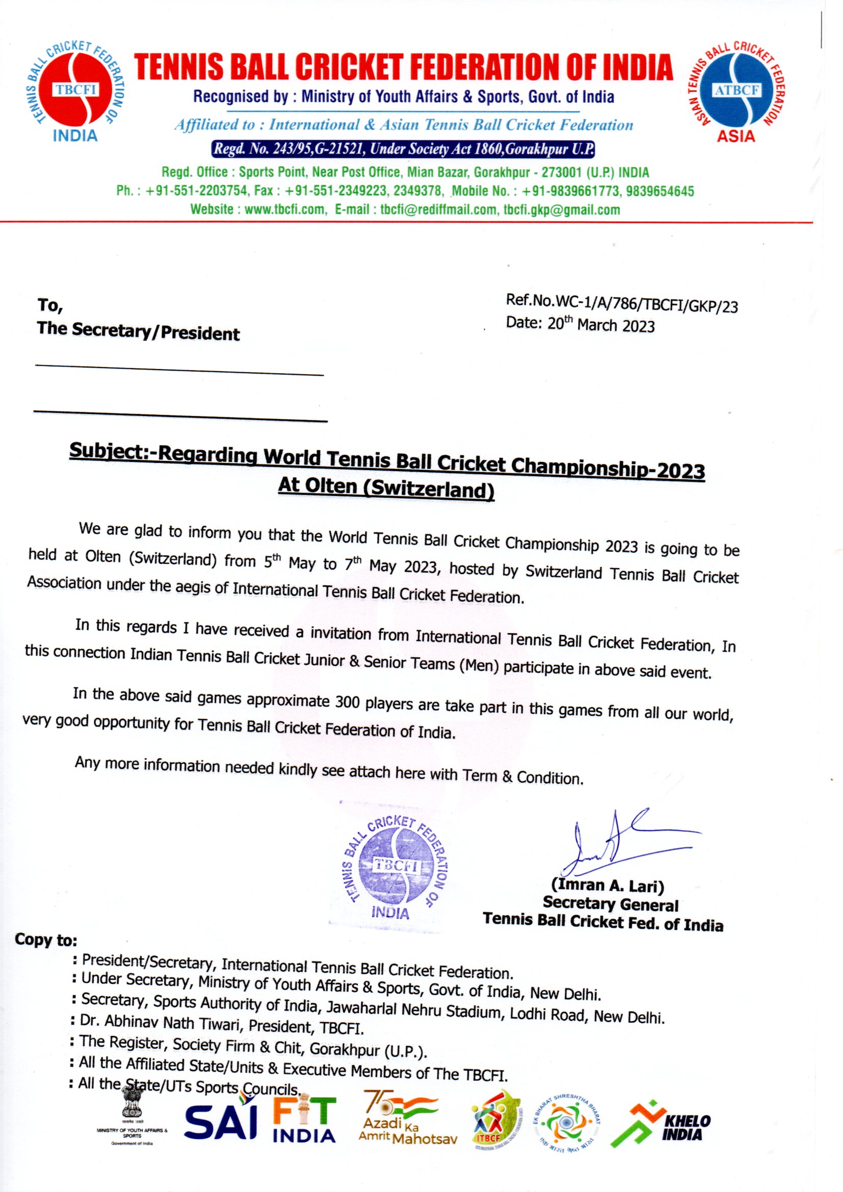 Affilated To : International & Aasian Tennis Ball Cricket Federation